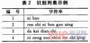 ②寫入識別列表。列表的規(guī)則是,每個(gè)識別條目對應(yīng)一個(gè)特定的編號(1個(gè)字節(jié)),編號可以相同,可以不連續(xù),但是數(shù)值要小于256(00H~FFH)。本芯片最多支持50個(gè)識別條目,每個(gè)識別條目是標(biāo)準(zhǔn)普通話的漢語拼音(小寫),每2個(gè)字(漢語拼音)之間用一個(gè)空格間隔。本文中采取了連續(xù)不同編號的識別條目,表2是簡單的示例。