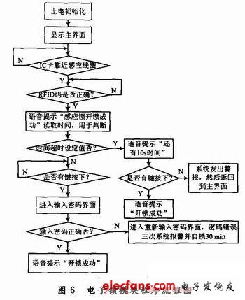 如圖2所示,電子鎖原始密碼和用戶設(shè)定密碼已存于外部存儲器E2PROM內(nèi),用戶要開門需先用電子感應(yīng)鑰匙開RFID碼感應(yīng)鎖,當感應(yīng)鎖成功開鎖時,系統(tǒng)將發(fā)出語音提示“感應(yīng)鎖開鎖成功”,然后輸入先前設(shè)定的密碼,密碼正確后,系統(tǒng)發(fā)出語音提示“開鎖成功”,否則提示“輸入密碼錯誤”。輸入密碼三次以上錯誤,系統(tǒng)將報警并自鎖30 min。整個開鎖時間不能超過30 s,否則系統(tǒng)發(fā)出警報聲,以防止盜賊在短時間內(nèi)利用萬能工具開鎖。系統(tǒng)待機時能在液晶上顯示時間、日期和星期等信息,實現(xiàn)友好的人機界面。