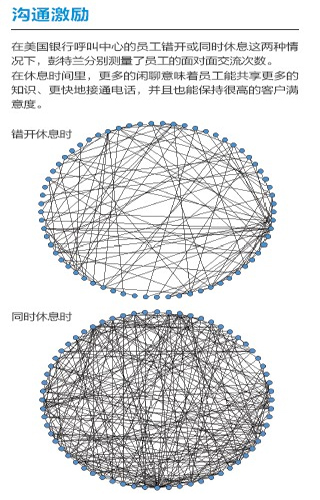 去年,彭特蘭的實驗室與美國銀行(Bank of America)設在羅得島(Rhode Island)的呼叫中心合作,在80 名中心員工身上安裝了社會傳感器。這種傳感器看起來像一枚不顯眼的徽章,使用藍牙和紅外信號監(jiān)測實驗對象每分鐘與哪些同事交談。測試活動先開展了一個月,后來又進行了6周。第一個月后,實驗室的研究人員發(fā)現(xiàn),與更多同事進行過交談的員工能夠更快地接通電話,他們自我感覺的壓力也相對較小,而客戶滿意度卻與其他人一樣高。與刻板地遵循員工手冊或服從經(jīng)理的電子郵件指示相比,通過非正式的閑聊來交流問題和解決方案似乎能取得更好的結(jié)果。有了這種結(jié)論之后,該呼叫中心嘗試盡量將員工的休息時間安排在一起,而非像過去那樣錯開。這樣員工就有了更多的時間參與閑聊。幾個月后,美國銀行向?qū)嶒炇覉蟾媪私Y(jié)果:該呼叫中心獲得了相當于每年1,500 萬美元的生產(chǎn)力提升。