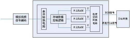 嵌入式攝像控制系統除了必要的電源電路以外,還要包括存儲電路、通信電路和下載電路等,所有的設備均與Avalon總線連接,這里主要介紹用戶邏輯接口Camera_show,它完成了模擬視頻數據轉化成數字視頻數據并在VGA上顯示的功能,主要包括模擬視頻信號的采集、分配(串并轉換電路完成)、存儲(存儲控制邏輯和片上RAM完成)和色度空間轉換。具體的功能框圖如圖1所示。