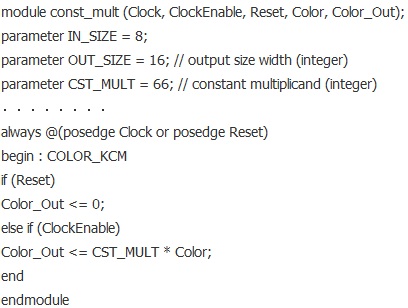 用Verilog HDL編寫代碼,實現YUV到RGB的轉化。其中共包括3個模塊跟1個仿真激勵。在模塊const_mult中,主要實現乘法運算,主要代碼如下: