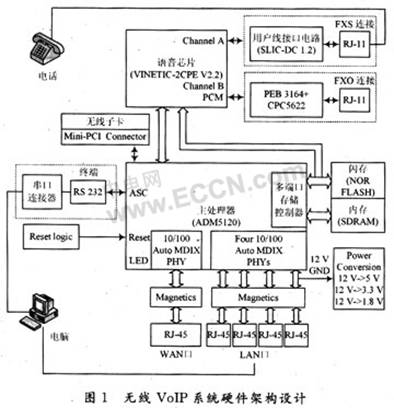 系統(tǒng)硬件的整體架構(gòu)設(shè)計(jì)如圖1所示。系統(tǒng)硬件主要由五部分組成:ADM5120主處理器部分、通話控制部分、無線子卡部分、存儲(chǔ)部分和外設(shè)連接部分。通話控制部分采用Infineon公司語音芯片VINETIC-2CPE,Version 2.1(PEB3322)為子處理器,外接A/D,D/A轉(zhuǎn)換功能的用戶接口電路SLIC-DC PEB4268,與存儲(chǔ)部分一起構(gòu)成語音實(shí)時(shí)處理骨架;無線子卡部分采用Atheros公司的WMIA-165G 802.11g Mini PCI模塊,并用Madwifi驅(qū)動(dòng)無線子卡;存儲(chǔ)部分使用2塊SDRAM存儲(chǔ)器和1塊NOR FLASH存儲(chǔ)器;外設(shè)連接部分包括一個(gè)WAN口和四個(gè)LAN口、Mini-PCI接口、輸出模擬電話信號(hào)的RJ-11接口,以及用于調(diào)試的RS 232串口。