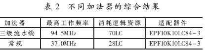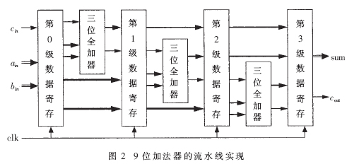 (2)針對不同運算的位寬需要,設(shè)計專用的加法器和乘法器。本文對整數(shù)變換中的加法器采用三級流水線加法器,實現(xiàn)9位加法,每級流水線完成三位超前進位加法,將邏輯延遲限制在三位加法器之內(nèi)。圖2給出了9位加法器的流水線實現(xiàn)框圖。選用EPF10K10LC84-3作為適配器件,經(jīng)過Synplify Pro 7.3綜合,結(jié)果表明這種加法器具有較優(yōu)的最高工作頻率和硬件開銷。如表2所示, 常規(guī)加法器的最高工作頻率為37.0MHz,消耗資源卻為28LC,而經(jīng)過優(yōu)化的三級流水線加法器在消耗資源增加不多的情況下,其最高工作頻率相比常規(guī)加法器提高了257%,達到94.5MHz。