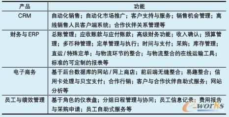 NetSuite國際版是行業(yè)領(lǐng)域首個也是目前唯一一款能夠支持整個公司業(yè)務(wù)流程的在線商業(yè)軟件。此產(chǎn)品可以給客戶從客戶關(guān)系管理(CRM)到企業(yè)資源規(guī)劃(ERP)再到網(wǎng)站功能的全面支持(見表1)。