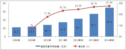 根據(jù)對(duì)下游行業(yè)的調(diào)研和關(guān)聯(lián)市場(chǎng)的分析,2010年,中國(guó)指揮調(diào)度市場(chǎng)規(guī)模已達(dá)到28.1億元。隨著下游行業(yè)投資規(guī)模的擴(kuò)大、產(chǎn)品的升級(jí)換代及技術(shù)的發(fā)展,行業(yè)市場(chǎng)規(guī)模將保持較快的增長(zhǎng)速度,未來4年的復(fù)合增長(zhǎng)率為26.31%,2014年,市場(chǎng)規(guī)模將達(dá)到69.8億元。