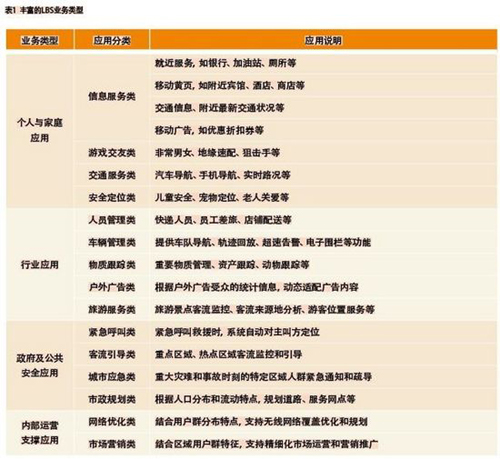 傳統(tǒng)LBS應(yīng)用主要是緊急呼叫、車輛導(dǎo)航、物流管理、人員定位等,其實(shí)LBS作為一種基本能力,可以擴(kuò)展到各類業(yè)務(wù)應(yīng)用中。根據(jù)面向的服務(wù)對(duì)象的不同,LBS業(yè)務(wù)可以分為個(gè)人與家庭應(yīng)用、行業(yè)應(yīng)用、政府與公共安全應(yīng)用和運(yùn)營(yíng)商內(nèi)部運(yùn)營(yíng)支撐應(yīng)用四大類型。每種LBS業(yè)務(wù)類型都包括各類豐富應(yīng)用(如表1),這里僅列舉部分應(yīng)用進(jìn)行簡(jiǎn)要探討。