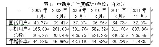 政府對(duì)電信市場(chǎng)的開放不僅帶來(lái)了電信產(chǎn)業(yè)的快速發(fā)展,激烈的競(jìng)爭(zhēng)也令消費(fèi)者享受到性價(jià)比更高的服務(wù)。近幾年,電話用戶總數(shù)持續(xù)增長(zhǎng),從1999年的2281萬(wàn)增加到2011年3月底的8億4633萬(wàn)。截至2011年12月31日,電話用戶總數(shù)達(dá)到9億2655萬(wàn),說(shuō)明從2011年4-12月期間新增用戶8022萬(wàn)。其中,手機(jī)用戶數(shù)增長(zhǎng)最為顯著,從2007年的1億6509萬(wàn)增加到2011年3月的8億1160萬(wàn),2011年12月底達(dá)到8億9386萬(wàn)。但是,固話用戶的數(shù)量則從2007年的4077萬(wàn)減少到2011年3月的3473萬(wàn),到2011年12月僅有3269萬(wàn)。(見表1)