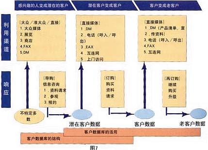 ——銷售支持:東京煤氣公司擁有三種主要的家用產品:地板式空調,煤氣暖氣及煤氣衣服干燥機。此公司于1993年開始運用數據庫營銷,現已取得了驕人的成果。其中主力產品——地板式空調,盡管周期長、價格高,1997年一年就銷售了3萬6千套,同時從對這些用戶調查的結果發(fā)現“滿意”的占96%。下面介紹一下“地板式空調”的營銷方法(見圖5)