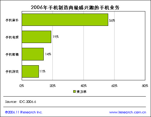 iResearch艾瑞市場咨詢根據(jù)IDC統(tǒng)計數(shù)據(jù)顯示,2006年手機制造商最感興趣的手機業(yè)務(wù)情況,手機音樂是手機制造商最感興趣的業(yè)務(wù),提及率達(dá)到56%,然后依次是手機電視19%、手機郵箱14%以及手機游戲11%.