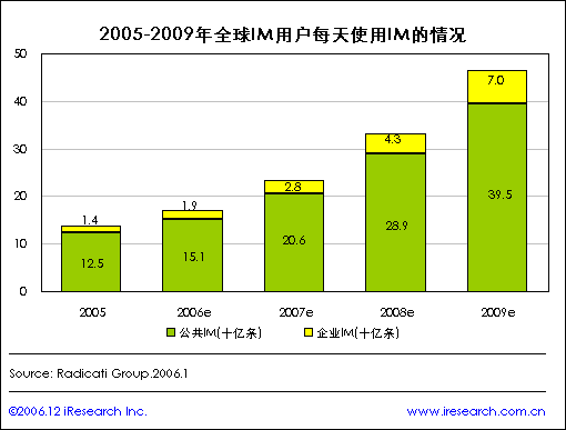 iResearch艾瑞市場(chǎng)咨詢根據(jù)Radicati Group統(tǒng)計(jì)顯示,到2005年底,全球總共有超過8.67億人在使用即時(shí)短信息軟件,到2009年,這個(gè)數(shù)字會(huì)增至12億。而整個(gè)IM市場(chǎng)(包括公眾IM和企業(yè)所用的EIM以及IM管理軟件)到2005年底將達(dá)到1.42億美元,到2009年更會(huì)增長(zhǎng)到3.65億美元。據(jù)Radicati統(tǒng)計(jì),目前每天網(wǎng)絡(luò)上發(fā)送的IM信息達(dá)139億條,其中125億條在公眾網(wǎng)絡(luò)上發(fā)送,14億條在企業(yè)內(nèi)部通過EIM發(fā)送。從IM軟件用戶的增長(zhǎng)趨勢(shì)可以預(yù)測(cè)出,到2009年,網(wǎng)絡(luò)上每天發(fā)出的IM信息數(shù)量將達(dá)到465億條,其中395億條在公眾網(wǎng)絡(luò)上傳輸,其余70億條在企業(yè)內(nèi)部傳輸。