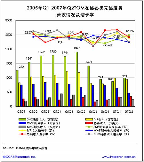 艾瑞市場咨詢整理從2005年第一季度至2007年第二季度以來TOM在線各無線服務(wù)類別的營收情況顯示,2005年第一季度至2006年上半年,TOM在線各無線服務(wù)類別的營收基本上處于上升階段,尤其以短信服務(wù)和IVR(語音互動增值服務(wù))為主要增值點。