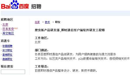 百度有意推IM產(chǎn)品的傳聞?dòng)蓙硪丫茫贿^該傳聞一直未得到官方證實(shí)。但在其官網(wǎng)最新公布的招聘頁面中,百度已向外界羅列出即時(shí)通信客戶端軟件研發(fā)工程師(搜索新產(chǎn)品研發(fā)部)、即時(shí)通信軟件產(chǎn)品經(jīng)理(客戶端軟件業(yè)務(wù)部)等職位,上述工作地點(diǎn)均在北京,可見百度的IM戰(zhàn)略布局已具雛形。