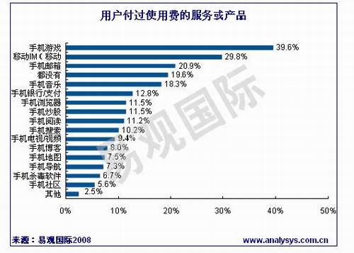 據(jù)易觀國(guó)際《中國(guó)手機(jī)應(yīng)用市場(chǎng)用戶(hù)調(diào)研報(bào)告2008》研究發(fā)現(xiàn),用戶(hù)付過(guò)使用費(fèi)的手機(jī)應(yīng)用服務(wù)及產(chǎn)品中,手機(jī)游戲、移動(dòng)IM和手機(jī)郵箱的比例較高。其中39.6%的手機(jī)應(yīng)用用戶(hù)付費(fèi)玩過(guò)手機(jī)游戲,29.8%的用戶(hù)曾經(jīng)為移動(dòng)IM付費(fèi),而手機(jī)郵箱的付費(fèi)用戶(hù)將達(dá)20%。其他手機(jī)應(yīng)用產(chǎn)品或服務(wù)中,付費(fèi)用戶(hù)的比例相當(dāng),均在10%左右,但是有近20%的用戶(hù)沒(méi)有用過(guò)任何的付費(fèi)服務(wù)或產(chǎn)品。