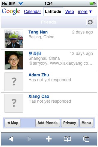 在Android手機老早就支持Google Latitude之后,Google終于把iPhone給想起來了,近日他們發(fā)布了Google Latitude for iPhone,用你的iPhone訪問這個地址即可:http://m.google.com/latitude