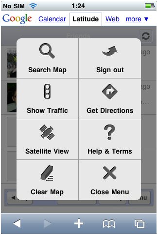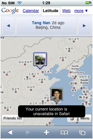 但是我沒找到在哪里設置自己的Latitude,就是說如果你不想共享自己的位置了怎么辦?想隱藏位置怎么辦?或者iPhone探測的不準,想手動調(diào)節(jié)位置,怎么辦?(當然大多數(shù)時間探測都是準的,這個功能是方便某些人讓別人誤認為自己在某個地方,然后偷偷摸摸的去做別的事情……)這些Phone在網(wǎng)頁里還做不到,但G1可以,畢竟G1是在Google Maps應用里完成Latitude的。