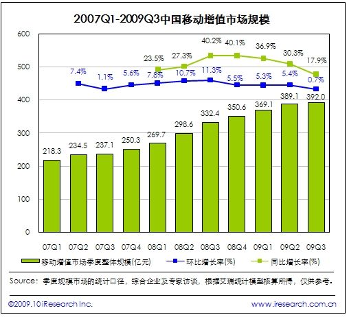 2009Q3中國移動增值市場規(guī)模達(dá)392.0億元,同比增長17.9%,環(huán)比增長0.7%。