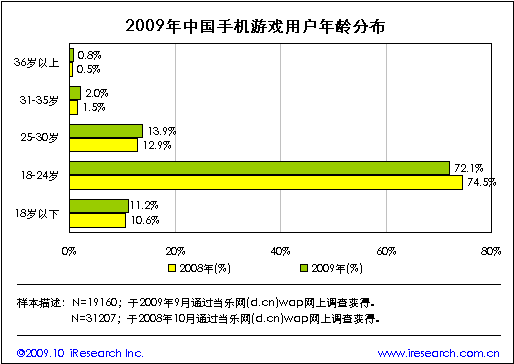 當(dāng)樂網(wǎng)調(diào)研數(shù)據(jù)顯示,2009年手機(jī)游戲用戶群體仍以年輕群體為主體,其中18-24歲的用戶占比為72.1%,較去年下降2.4個(gè)百分點(diǎn)。與去年相比,25歲以上及18歲以下的手機(jī)游戲用戶群體占比均出現(xiàn)一定程度的增長。25歲以上用戶群體的增長表明手機(jī)游戲用戶群體正在由年輕群體向成熟群體擴(kuò)展。與此同時(shí),手機(jī)終端作為新的游戲媒體形式對18歲以下的青少年群體具有較強(qiáng)的吸引力。