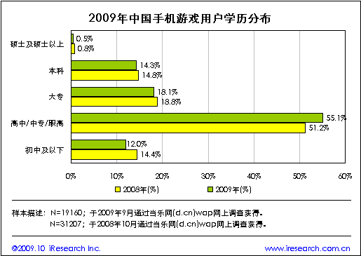 當(dāng)樂網(wǎng)調(diào)研數(shù)據(jù)顯示,2009年手機(jī)游戲用戶中高中(含中專、職高)部分的比例較2008年有所增長,增長幅度達(dá)3.9個(gè)百分點(diǎn),其余各學(xué)歷階段的用戶比例則均出現(xiàn)不同程度的下降。