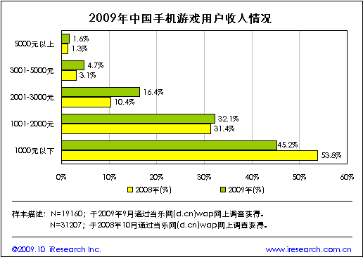 當(dāng)樂網(wǎng)調(diào)研數(shù)據(jù)顯示,2009年手機(jī)游戲用戶的月收入在1000~3000元之間的占比為48.5%,較2008年增長6.7個(gè)百分點(diǎn)。收入高于2000元的中高收入用戶群體占22.7%,比2008年占比上升7.9個(gè)百分點(diǎn),收入在1000元以下的低收入群體占45.2%,比2008年占比減少8.6個(gè)百分點(diǎn)。與2008年對比,2009年手機(jī)游戲用戶的收入水平有明顯提高,用戶的消費(fèi)潛力有所增強(qiáng)。