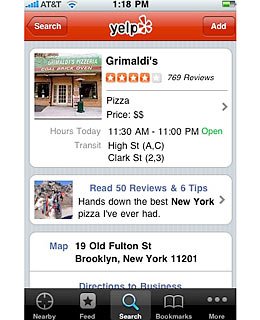 Yelp應(yīng)用能為iPhone用戶提供身邊餐館、酒吧等的評(píng)論。
