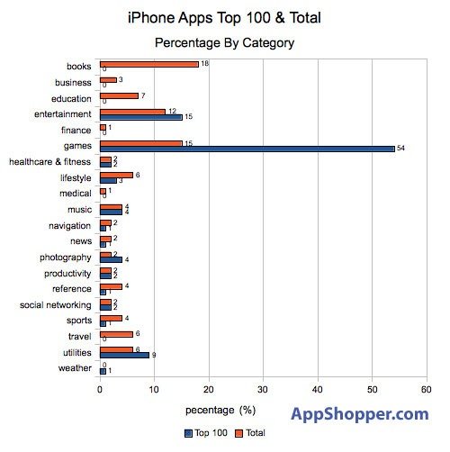 下圖是iPhone和iPod touch的Top100軟件(藍色)與軟件總數(shù)量(橙色)在各個軟件類別中的分布比例。可以看出: