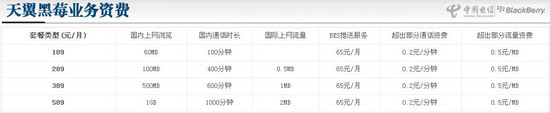 目前電信推出的黑莓手機套餐分為四類,一類為天翼黑莓簡裝版,價格為每月189元,包括60MB國內上網流量,100分鐘國內語音通話時長;第二類是天翼黑莓標準版套餐,價格為289元,包括100MB國內上網流量,0.5MB國際上網流量,400分鐘國內語音通話時長;第三類和第四類為天翼尊享版套餐包括389元和589元兩種資費,前者包括500MB國內上網流量,1MB國際上網流量,600分鐘國內語音通話時長;后者包括1GB國內上網流量,2MB國際上網流量,1000分鐘國內語音通話時長。