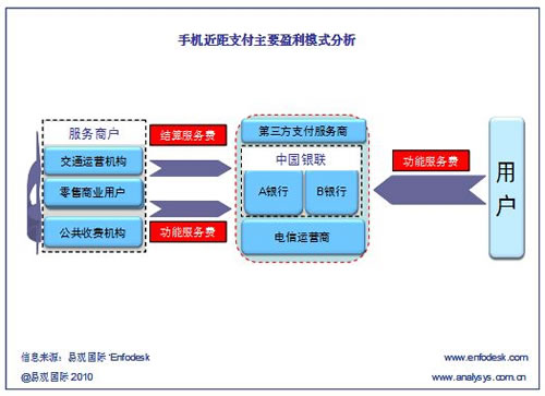 根據(jù)Enfodesk易觀智庫近期發(fā)布的《中國手機(jī)支付市場系列專題報告2010——近距支付》報告顯示,手機(jī)近距支付的主要盈利模式只有三種:即前向用戶服務(wù)費、結(jié)算手續(xù)費和后向商戶服務(wù)費。