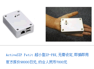 日本C-Borne公司發(fā)布了世界上最小的IP-PBX產(chǎn)品ActiveSIP Petit,采用Asterisk(米國Digium,Inc.開発),具備昂貴的專有PBX所有功能。這款比手掌還要小的IP-PBX設(shè)備適合小型辦公室和商店使用,可以通過網(wǎng)絡(luò)更新配置和設(shè)置,無需專業(yè)IP人士也可以搭建IP-PBX環(huán)境。利用楽天株式會社的Fusion通訊服務(wù),將大大降低成本電話費(fèi)和電信設(shè)備投資。