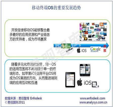 易觀國際(Analysys International)在近期發(fā)布易觀智庫Enfodesk《中國移動互聯(lián)網(wǎng)行業(yè)年度綜合報告2011》中對于移動終端OS部分進行了深入的研究。易觀國際認為,隨著3G和移動互聯(lián)網(wǎng)的迅猛發(fā)展,多樣化的移動應用體系逐漸形成,促使具有獨立OS的智能手機市場規(guī)模不斷擴大。移動終端OS作為用戶與終端進行交互的操作接口,以及移動應用、內(nèi)容、服務運行的平臺,對于移動互聯(lián)網(wǎng)的發(fā)展起著至關重要的意義。未來在各種形態(tài)移動互聯(lián)網(wǎng)應用和服務爆發(fā)性增長的情況下,移動終端OS生態(tài)圈建設將走向開放,并促使多元化終端之間的互聯(lián)互通,成為終端發(fā)展的新機遇。