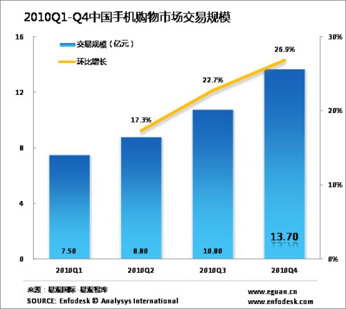 2010年是中國手機(jī)購物市場(chǎng)的元年。淘寶網(wǎng)、京東商城、卓越亞馬遜等平臺(tái)已經(jīng)紛紛搭建了自己的手機(jī)購物平臺(tái),包括WAP和客戶端模式。而買賣寶等獨(dú)立手機(jī)購物平臺(tái)的發(fā)展也引人注目。雖然支付瓶頸尚未解決,但是三四線城市以及務(wù)工群體手機(jī)購物的需求還是爆發(fā)于手機(jī)支付手段成熟的前夜。