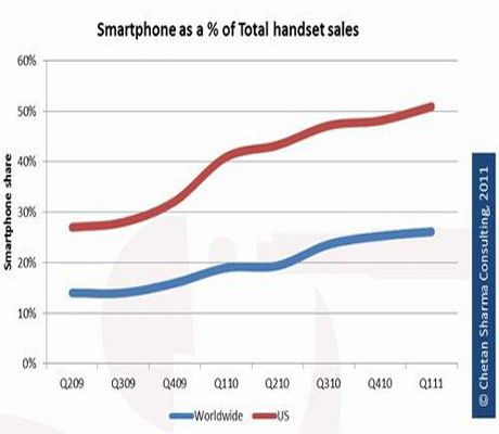 目前全球智能手機(jī)用戶占手機(jī)總用戶的26%。美國(guó)已突破新購(gòu)手機(jī)中50%為智能手機(jī)的臨界值。
