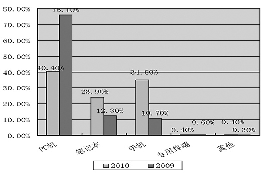 以手機為閱讀載體的比例從2009年的10.7%激增到2010年的34.8%。相比之下,PC機閱讀則出現(xiàn)了大幅度地滑落,從2009年的76.1%下降到2010年的40.4%?梢,大部分通過PC機閱讀的讀者更加傾向或習慣于手機閱讀。