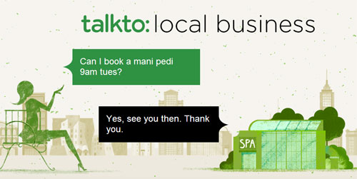 這一切是怎樣實現(xiàn)的呢?TalkTo通過短信與商家溝通。用戶可以通過web應用在TalkTo目錄中搜索需要的服務,輸入商家的詳細地址或者大概位置,TalkTo就可以確保商家看到用戶的短信。TalkTo用戶可以向商家提出問題和意見,或直接預定服務!斑@一切就像和朋友發(fā)短信一樣簡單!