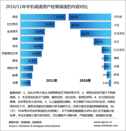 對(duì)比2011年與2010年手機(jī)閱讀用戶經(jīng)常閱讀內(nèi)容分類的調(diào)查顯示, 用戶經(jīng)常閱讀的內(nèi)容中,文學(xué)作品占比從56%降至39.5%,而社交資訊、博客、雜志類內(nèi)容占比上升,2010年社交資訊、博客、雜志類占比分別為13%、10%、24%,相應(yīng)的2011年占比分別為28.4%、26.5%、26.4%。
