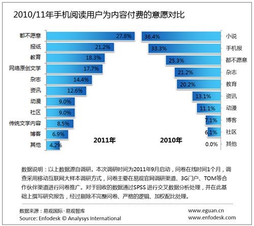 據(jù)易觀國際(Analysys International)《2011年中國手機(jī)閱讀市場(chǎng)用戶研究報(bào)告》研究發(fā)現(xiàn),2011年整體手機(jī)閱讀市場(chǎng)付費(fèi)意愿有所降低。