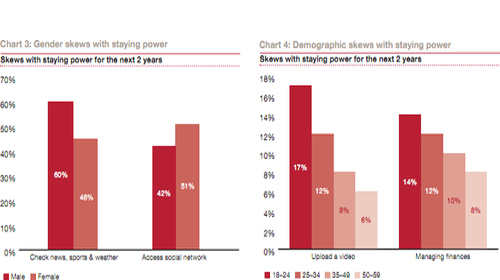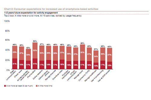而在未來(lái)兩年,這些不同的功能使用只會(huì)越來(lái)越多,像基本的通信功能、LBS等,21%的用戶預(yù)計(jì)使用的程度將是今天的2倍以上