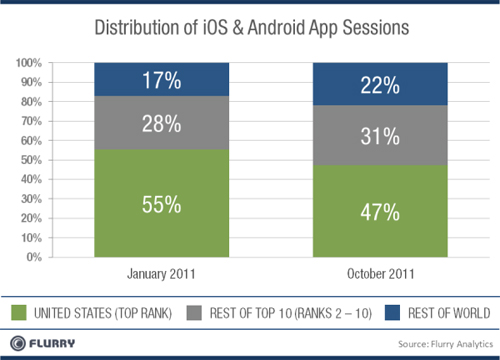 使用iOS和Android設(shè)備和其他新技術(shù)一樣,最早開(kāi)始于可支配收入較高的北美和西歐地區(qū)。然而,隨著型號(hào)較舊的iOS產(chǎn)品價(jià)格下降,以及Android設(shè)備的生產(chǎn)商提供了更多大家買得起的低價(jià)設(shè)備,包括新興市場(chǎng)在內(nèi)的國(guó)際市場(chǎng)的消費(fèi)者越來(lái)越多。下圖顯示了移動(dòng)應(yīng)用下載如何擴(kuò)張到美國(guó)之外。