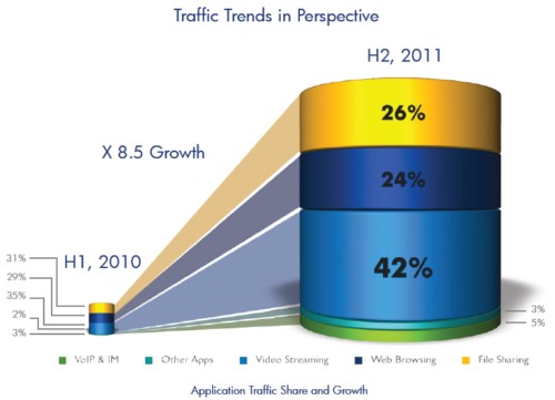 Allot 通訊公司在2012年2月出的報告中,2011年下半年,視頻流媒體在手機(jī)流量中始終占著絕對優(yōu)勢,相比2010上半年的占全球帶寬比35%,增長到了42%;網(wǎng)絡(luò)共享排第二位,占26%,相比2010上半年下降了31%;同時網(wǎng)頁瀏覽量也有所下降,同期從29%下降到24%;網(wǎng)絡(luò)電話與即時訊通在下半年僅僅占了3%。整體來看,全球手機(jī)無線業(yè)務(wù)流量在下半年相比上半年增長了83%,復(fù)合年增長率為234%。