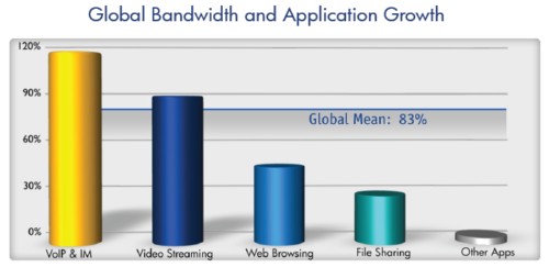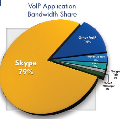 雖然網(wǎng)絡(luò)電話與即時通訊在下半年的網(wǎng)絡(luò)帶寬中占比仍然很低,它們的申請量證明了其在高速發(fā)展,相比上半年提升了114%。在下半年,Skype占了全球手機(jī)網(wǎng)絡(luò)電話使用量的79%。然而由于新競爭者所帶來的壓力,它的份額根據(jù)上半年的82%有所下降,這些新出來的同行包括Viber,它的迅速成長使其已經(jīng)占到了全球網(wǎng)絡(luò)電話流量的2%,超過了GoogleTalk 及Windows Live(這兩者都占1%)。