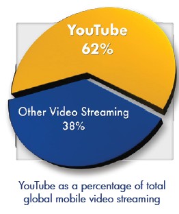 與此同時,Allot通訊公司在他們的“全球帶寬流量報告”中表明,在2011年11下半年,在全球用戶所觀看的在線視頻中,YouTube占了62%的份額,也就是說,單YouTube就占據(jù)了全球帶寬的24%。其高清視頻流量占了其總流量的14%,相對上半年的11%來說,同比上升了27%。總而言之,YouTube流量上升了143%,而整個互聯(lián)網(wǎng)帶寬消耗上升了88%。