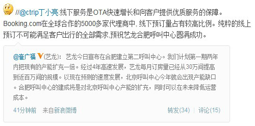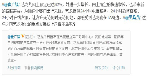 崔廣福在微博上說:“藝龍的網(wǎng)上預(yù)定已達(dá)62%,并進(jìn)一步增長(zhǎng)。網(wǎng)上預(yù)定的快速增長(zhǎng),也帶來新的客服需要。為確保讓客戶出行無憂,藝龍?zhí)峁?4小時(shí)電話服務(wù)、24小時(shí)微博客服、24小時(shí)在線客服,讓客戶無論何時(shí)無論何地,都感受到藝龍就在TA身邊!