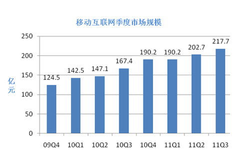 上圖是易觀國際發(fā)布的移動互聯(lián)網(wǎng)的相關(guān)數(shù)據(jù),數(shù)據(jù)截止到2011年第三季度,該圖顯示,2009年全球經(jīng)濟(jì)復(fù)蘇之后,移動互聯(lián)網(wǎng)業(yè)務(wù)收入一直保持著良好的增長狀態(tài),最新數(shù)據(jù)表明,2011年移動互聯(lián)網(wǎng)的整體市場規(guī)模已達(dá)到851億,遠(yuǎn)超過2010年的637億,增長率將近33.6%,在移動互聯(lián)網(wǎng)業(yè)務(wù)子領(lǐng)域中,表現(xiàn)最突出的是移動電子商務(wù),與2009年相比較,移動電子商務(wù)所占比例由3%直線增長到11%。但是在手機(jī)閱讀和手機(jī)游戲方面則表現(xiàn)平平,有較大的增長空間。預(yù)計(jì)2012年3G用戶規(guī)模將增長到6億,將會超過互聯(lián)網(wǎng)用戶數(shù)量,智能機(jī)以及移動互聯(lián)網(wǎng)還會保持或者超過2011年的增長速率。