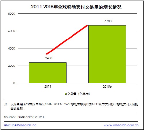 iResearch艾瑞咨詢整理Netbanker的最新數(shù)據(jù)發(fā)現(xiàn),2011年全球移動支付交易量達到2400億美元。該統(tǒng)計數(shù)據(jù)顯示,2015年全球移動支付交易量將達到6700億美元,使用手機銀行應用程序的用戶數(shù)量較2010年將增加45%左右。另外,預計在未來18個月內(nèi)還會有20個國家增設(shè)NFC服務(wù)。