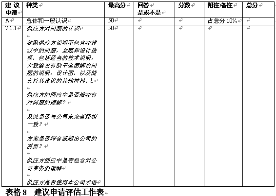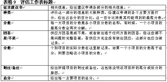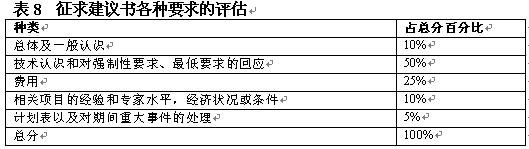 。。在決定了初步要求之后,評估小組應具體地開展評估工作。具體評估的目標是通過給建議書主要方面打分作出評估。可以在算出建議書各方面占總分數(shù)的百分比,如表8中對各方面的總覽。一般在建議書內向提供者給出這一信息。