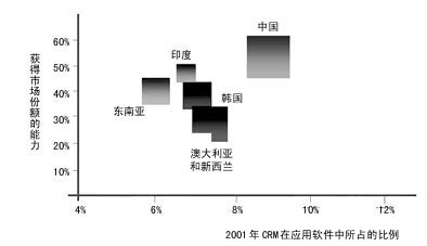 亞太地區(qū)正在成為CRM應用軟件的新興市場。1999年亞太地區(qū)CRM市場的年增長率達33.5%。其中中國CRM市場是除日本外最具發(fā)展?jié)摿Φ氖袌。預計到2004年,中國CRM市場的復合年平均增長率為60%。