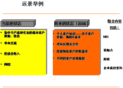 在評估當前情況與遠景,資源需求,癥結,極限以及鋪就路標和里程碑的關系時,實施展望和差距分析會議是十分重要的。取決于你對CRM遠景的定義——無論是它將成為一個能夠給你一把競爭利刃的企業(yè)策略 (類似的例子有Citicorp,Dell,F(xiàn)ord Motors) 或僅僅只是一個讓你更出眾的營銷項目——這邁出的第一步在你選擇CRM方法論的過程中都必將起到舉足輕重的作用。一個核心的方法論必須能夠支持企業(yè)大部分的業(yè)務和流程需求,如MIS;客戶體驗管理;接觸點管理;收益率管理等等。