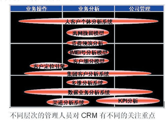 CRM系統(tǒng)自身的特點決定其不產(chǎn)生原始數(shù)據(jù),只是對其他相關(guān)系統(tǒng)所傳遞過來的數(shù)據(jù)進行數(shù)據(jù)抽取到展現(xiàn),所以CRM系統(tǒng)允許一定的數(shù)據(jù)誤差和延遲。但是在實際的建設(shè)和應(yīng)用過程中,廠家和運營商都發(fā)現(xiàn)數(shù)據(jù)的準確性和及時性是CRM系統(tǒng)應(yīng)用的最大瓶徑。同時早期參照國際標(biāo)準建立的CRM系統(tǒng)根本不符合國內(nèi)應(yīng)用的要求,于是才逐漸發(fā)展出現(xiàn)了A-CRM(操作型CRM)和O-CRM(運營型CRM)之分,用以滿足不同層次人員對CRM系統(tǒng)的應(yīng)用要求。