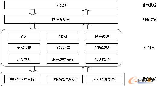 前端:瀏覽器,也叫企業(yè)門戶,可通過類似瀏覽網(wǎng)頁(yè)的形式登陸系統(tǒng),不受具體終端類型的限制;