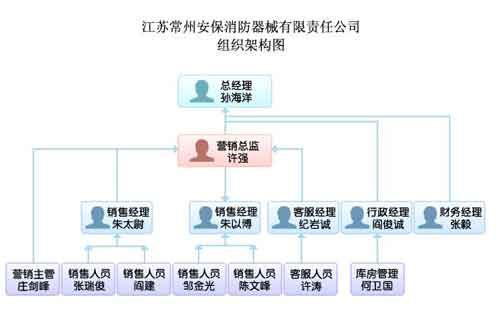 百會(huì)CRM模擬了“江蘇常州安保消防器械有限責(zé)任公司”的組織架構(gòu),設(shè)置了一套專門針對(duì)產(chǎn)品銷售型、生產(chǎn)制造型企業(yè)的CRM系統(tǒng),對(duì)CRM系統(tǒng)所提供的模塊和不同職位的人員所具備的權(quán)限都進(jìn)行了界定,這樣一套系統(tǒng)就足夠以銷售和生產(chǎn)制造為主的公司進(jìn)行使用。該公司的具體組織架構(gòu)見(jiàn)下圖。