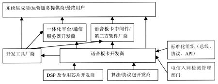 。。CTI板卡是插在計算機總線上,用于電話接口及有關(guān)處理的計算機板卡,又稱“語音卡”。語音卡是CTI系統(tǒng)中關(guān)鍵的硬件設(shè)備,它使得計算機和電話快速、緊密地結(jié)合在一起。CTI板卡不僅是一種產(chǎn)品,它已經(jīng)發(fā)展成為了一個產(chǎn)業(yè)。CTI板卡的產(chǎn)業(yè)鏈條所涉及的廠商和組織,如圖所示。